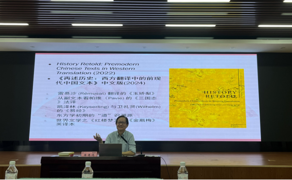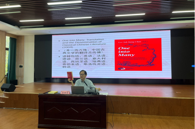 讲座伊始,陈教授介绍了他的两本专著:《本一而万殊:中国古典文学翻译及传播》和《再述历史:西方翻译中的前现代中国文本》,从中提出了古典文学外译的理论,翻译研究中有待全面探索的,是将经典著作从一种语言翻译成多种语言的现象。