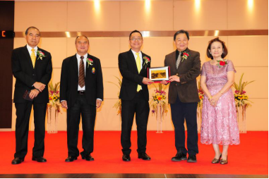 图二:罗选民教授向泰国教育部副部长赠送广西大学铂金画。