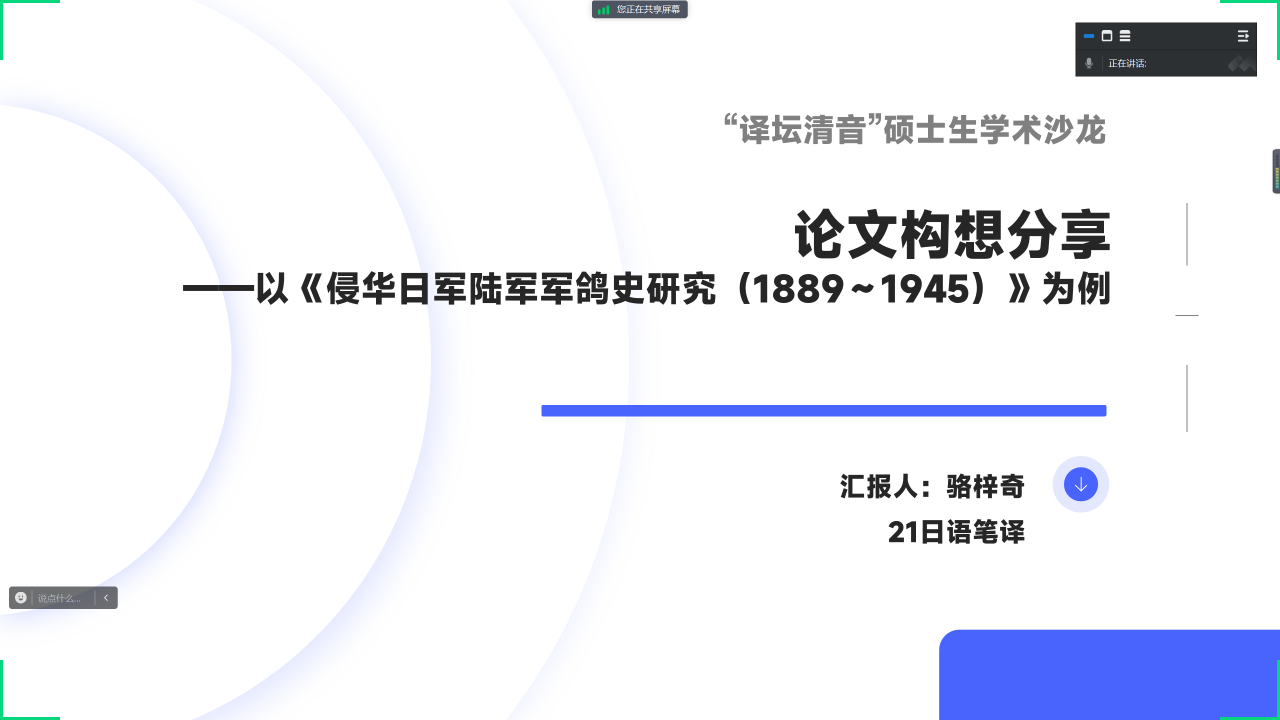 骆梓奇同学用线上方式以《侵华日军陆军军鸽史研究(1889-1945)》为例分享了精彩的论文构想、写作技巧和资料整理方法,并且做出了以下几点强调:一是要注重研究史料的真实性和准确性,需要亲自到史料馆进行资料的查询与考证,确保科研结果的严谨性。二是要注重研究课题的创新性与延展性。三是探究社科研究趋势,骆梓奇同学认为当今日语期刊融入社科研究是大势所趋。