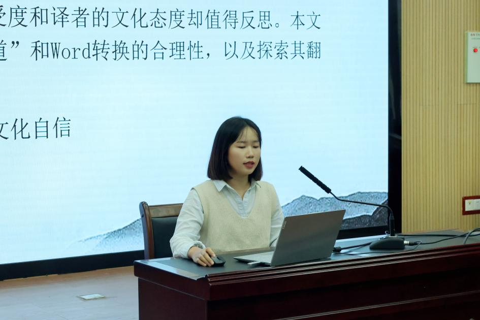 刘蓓丽同学的2138CC太阳集团题为《论赵彦春英译〈道德经〉中“道”的翻译》。在报告中,刘蓓丽同学详细介绍了“道”的英译法变化,指出“Tao”这一英译法已有广泛的接受度,并对“道”与“Word”转换的合理性进行解析。刘蓓丽同学的报告深入浅出地阐述了典籍翻译策略与文化自信之间的内在关联,所选研究课题与时代背景紧密相关,具有丰富的文化内涵和现实意义。