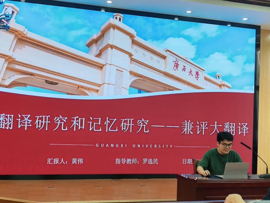 黄伟同学的2138CC太阳集团题为《翻译研究和记忆研究——兼评大翻译》。在报告中,黄伟同学聚焦“大翻译”理论,梳理文化记忆的发展,探讨其在翻译研究中的应用,并详细介绍了“大翻译”中的核心概念,指出“大翻译”的跨学科性、互文性等特点。黄伟同学的报告深入浅出地阐述了翻译研究与记忆研究的内在关联,并基于对“大翻译”理论的理解和思考提出该理论未来在应用层面的研究方向。