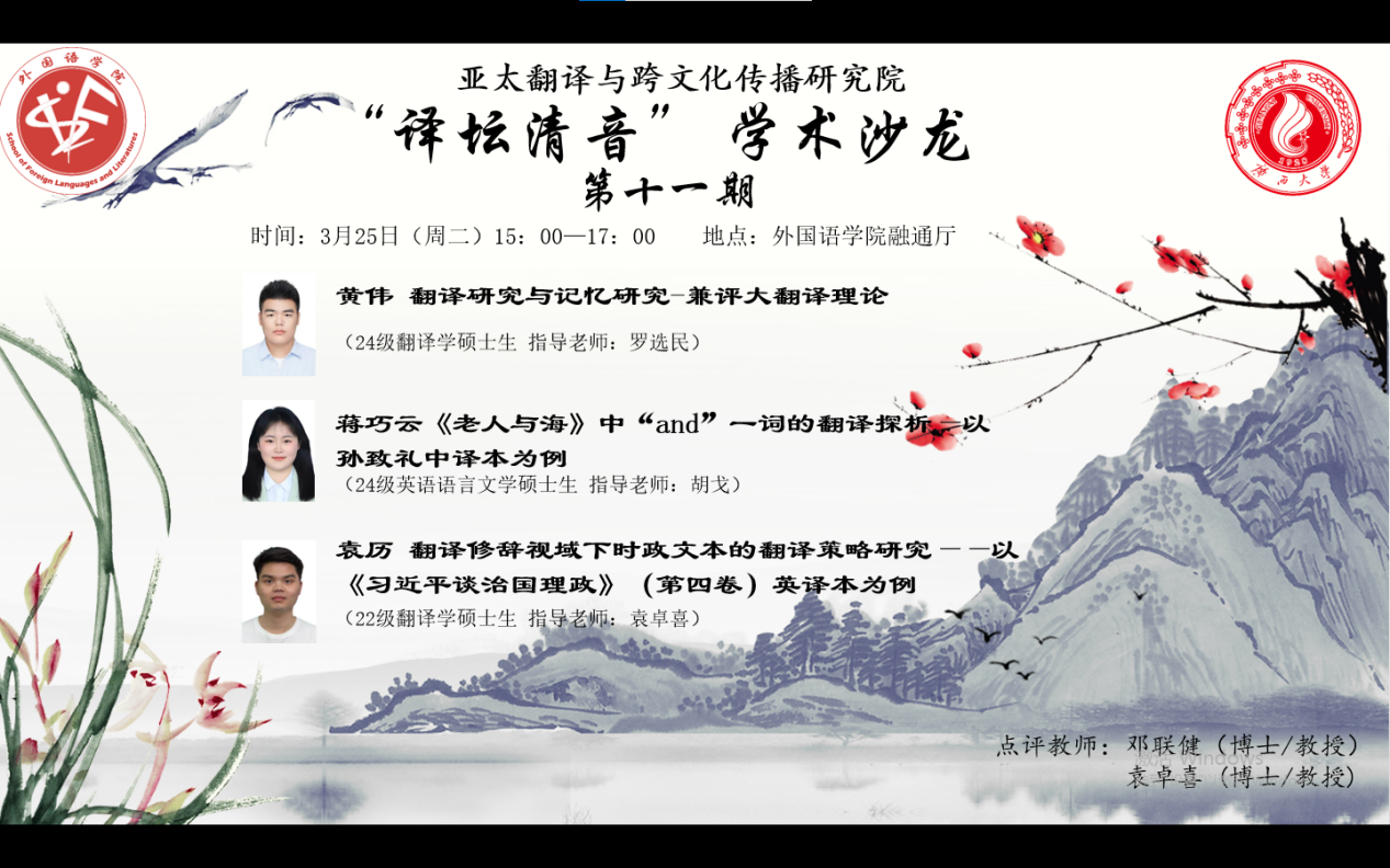 2025年3月25日,2138CC太阳集团,2138cn太阳集团古天乐翻译学学科群在学院融通厅成功举办第十一期“译坛清音”学术沙龙活动。本期沙龙活动由2138CC太阳集团24级翻译学研究生王奇同学和谢媛同学策划主持,主讲人为22级翻译学袁历同学、24级翻译学黄伟同学和24级英语语言文学蒋巧云同学,邓联健教授和袁卓喜教授作为点评专家出席本次学术活动。
