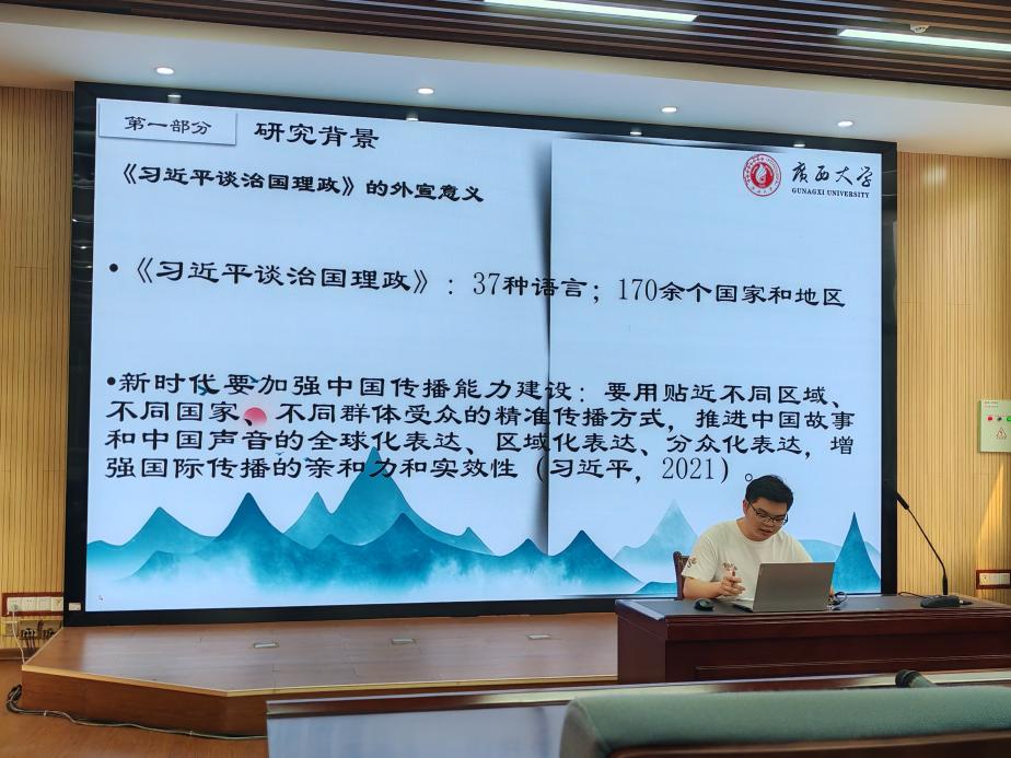 袁历同学作为本次沙龙活动的第一位主讲人,以《翻译修辞视域下时政文本的翻译策略研究——以<习近平谈治国理政>(第四卷)英译本为例 》为题,介绍了其论文的研究背景、翻译修辞与时政外宣的关系,并对翻译修辞视域下的时政文本翻译策略进行解析,指出“运用合适的修辞手段可使译文达到最佳的传播效果”。袁历同学的汇报具体全面,让大家对翻译修辞和外宣翻译有了更深刻的了解。