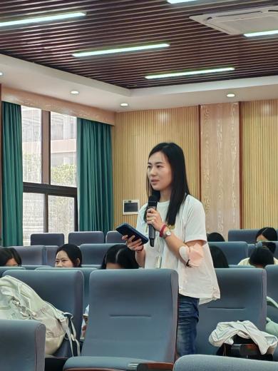 蒋巧云同学以《<老人与海>中“and”一词的翻译探析——以孙致礼中译本为例》为题,分享了自己的选题来源、研究方法及研究过程。在研究中,蒋巧云同学通过词频统计、案例分析等方式,探析“and”这一小词在孙致礼译本中的翻译,得出“and”在连接句子被译出时,往往能够对塑造人物形象、推动故事情节等有着积极的意义。蒋巧云同学的报告内容丰富、研究工作扎实,在讲解过程中逻辑清晰,其研究是“小题大做”的典范,为同学们提供了学术写作新思路。