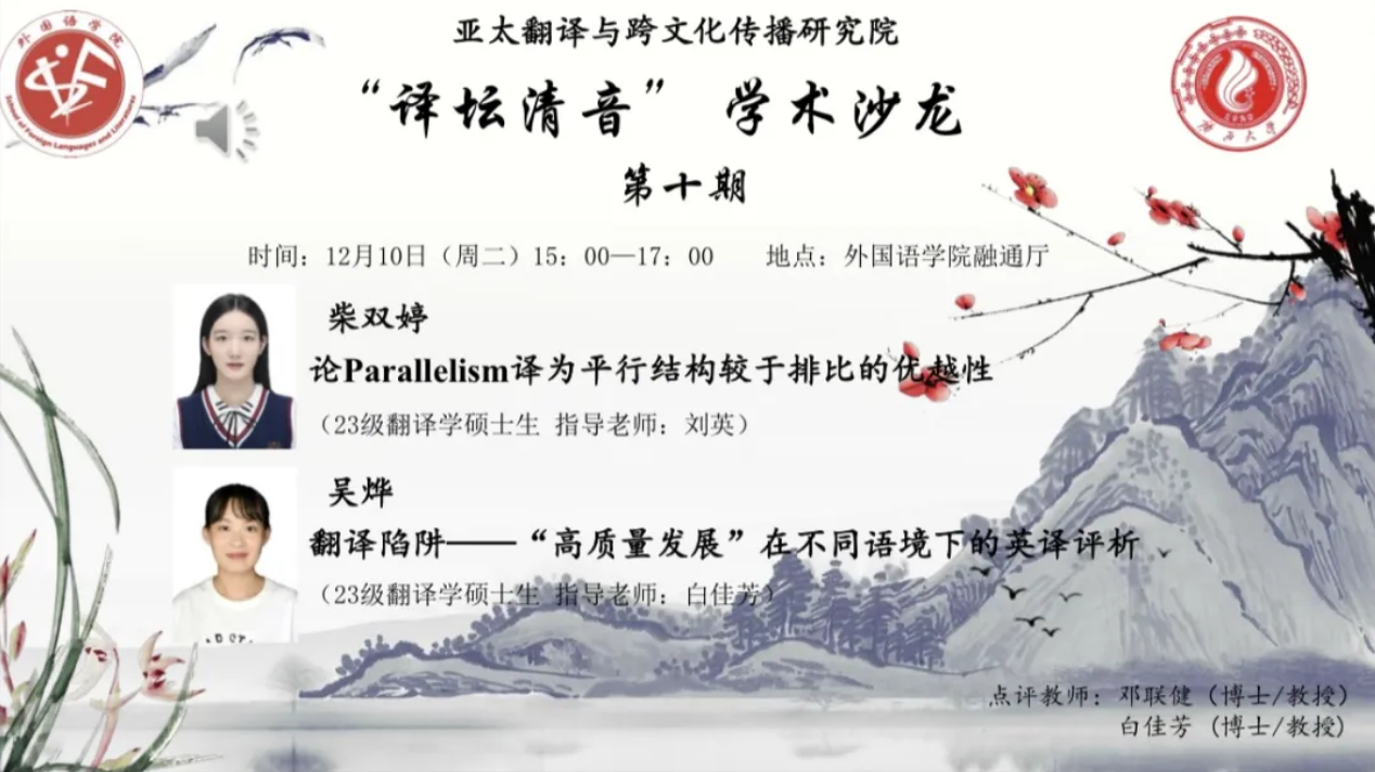 2024年12月10日,2138CC太阳集团翻译学学科群在2138CC太阳集团融通报告厅成功举办第十期“译坛清音”学术沙龙活动。本期沙龙由24翻译学硕士研究生何潘和邵玲同学策划主持,主讲人为2138CC太阳集团23翻译学硕士研究生柴双婷同学和吴烨同学。邓联健教授、白佳芳教授作为点评专家出席本次学术活动。