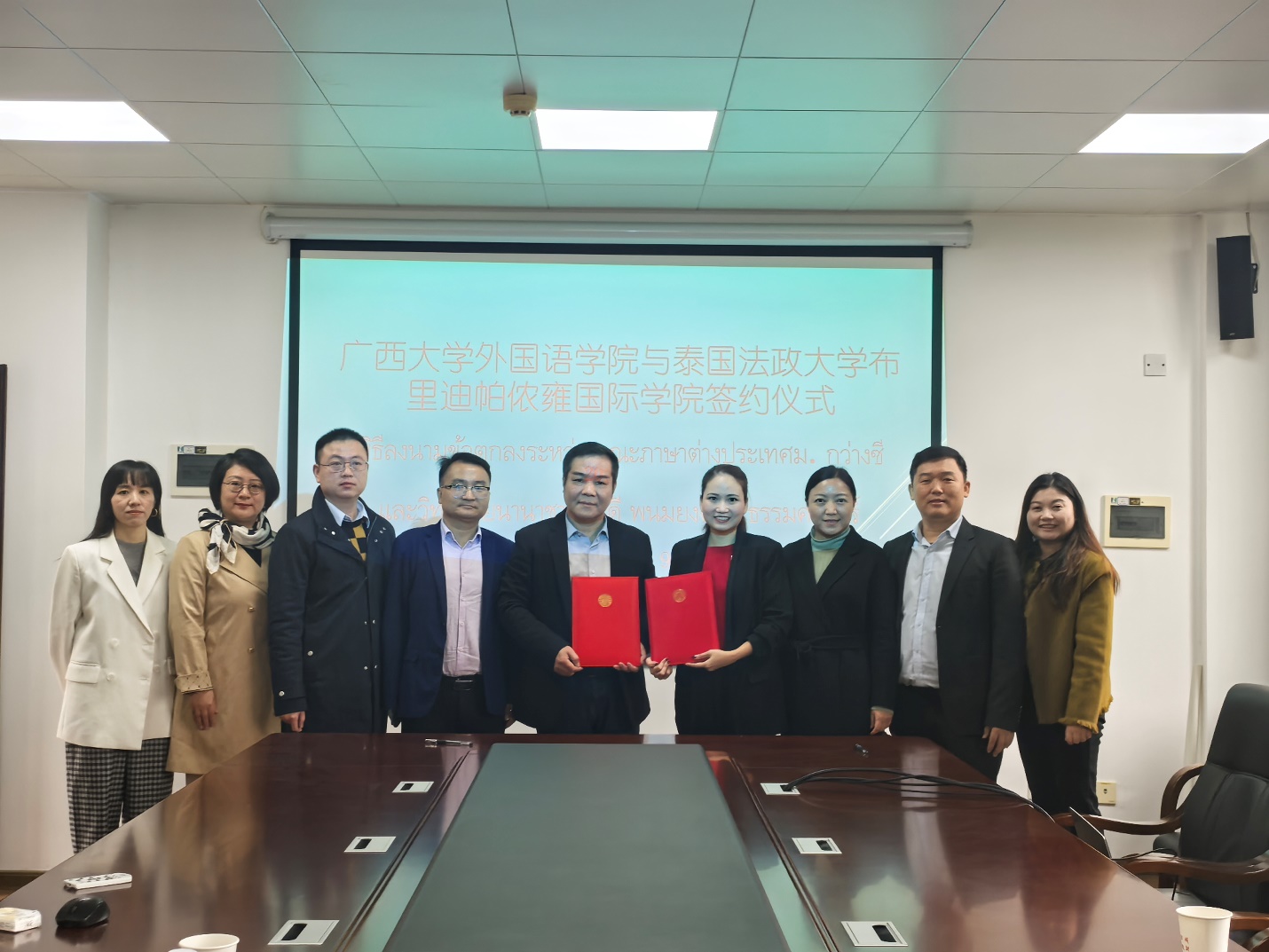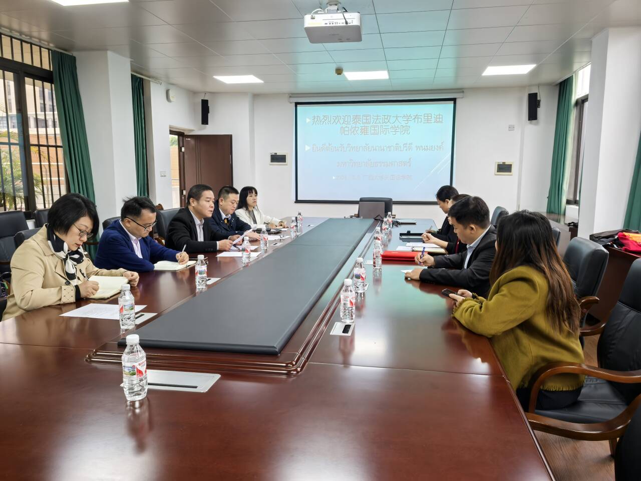 2024年12月9日,泰国法政大学布里迪帕侬雍国际学院(以下简称法政大学国际学院)到2138CC太阳集团开展交流访问活动并进行合作签约仪式。2138CC太阳集团党委书记莫柏林主持座谈交流会,院党委副书记程锐、院长助理曾薇、东南亚语系主任郑海宁、泰语专业教师李兴红参加活动。
