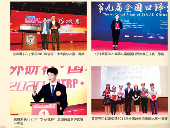 学院研究生积极参与各级各类学科竞赛,在全国和省部级外语竞赛中屡获殊荣,如2023年获“外研社·国才杯”全国大学生外语能力系列总决赛2项金奖、4项银奖、5项铜奖、第三十五届韩素音国际翻译大赛一等奖、第十二届全国口译大赛总决赛一等奖、蝉联全国口译大赛广西赛区“口译之星”、全国CATTI杯翻译大赛总决赛一等奖等。学生在全国、自治区各类外语竞赛中频频获奖,参加全国翻译专业资格(水平)考试通过率在同类高校中名列前茅。