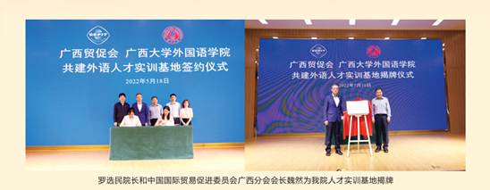 学院与中国-东盟博览事务局、广西壮族自治区外事办公室、南宁市外事办公室等15家校外单位合作联合培养人才,每年组织师生为“中国—东盟博览会”、“中国—东盟商务与投资峰会”、“中国—东盟区域合作发展论坛”、“中国—东盟产能与投资合作论坛”、“泛北部湾经济合作论坛”等国际会议、国际商贸洽谈、国际文体活动提供同声传译、交替传译、专业笔译等各种外语翻译服务和志愿者服务,通过政产学研协同育人的形式培养掌握扎实外语技能、服务区域社会经济发展的外语专业高层次人才,在中国—东盟自贸区建设和北部湾经济区建设中发挥重要作用。