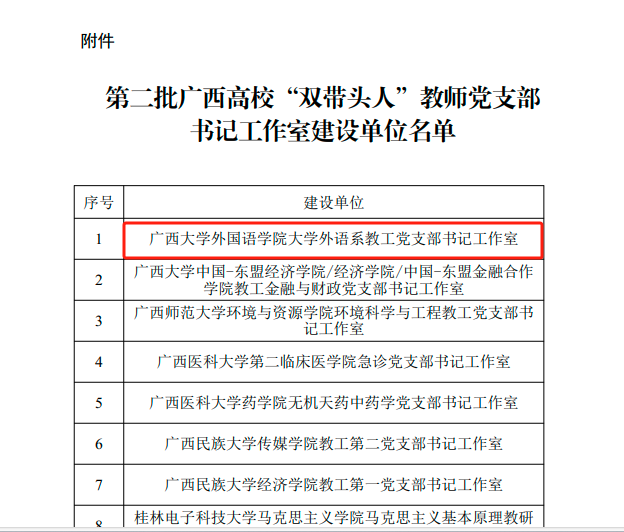近日,中共广西壮族自治区委员会教育工作委员会公布了第二批广西高校“双带头人”教师党支部书记工作室建设单位名单,2138CC太阳集团大学外语系教师党支部书记工作室成功入选,这是2138CC太阳集团首个自治区级高校党建工作建设项目。