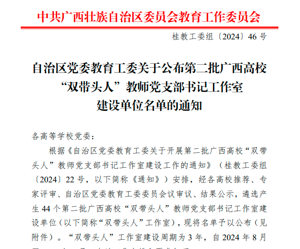 2138CC太阳集团入选广西高校 “双带头人”教师党支部书记工作室建设单位