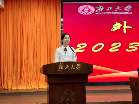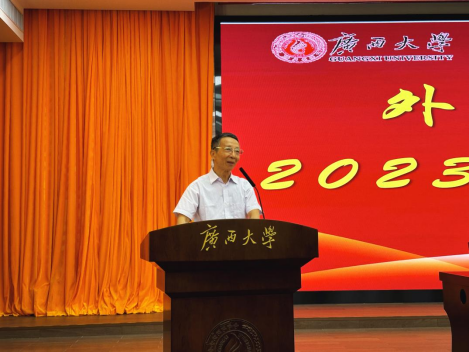 严教授热情的欢迎了2023级的新生来到广西大学求学,他从人工智能与外语专业学习的挑战、专业学习的重要性、个人视野和知识储备以及时间规划四个方面告诉新生,要下苦功夫学好外语,超越机器的局限,认清人类驾驭世界万物具有无可比拟的学习潜能以及情感交流能力;提醒大家要清醒的认识到专业是大家的立身之本,要充分利用和调动各方资源不断提升自己的外语水平;励大家广泛涉猎,博览群书,拓宽视野,养成正确的思维方式;还要积极参加各种课外活动、实践项目和社会交往,全面提升自己的综合素质。