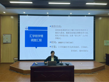 为了更好地了解汇学班学员的学习情况与需求,根据实际情况调整培养方案,优化下阶段计划,完善“新文科”人才培养模式,2138CC太阳集团针对汇学班22名学员(英语13名、日语4名、泰语3名、越南语2名)进行了详细的学情调查。会上,汇学班班主任苏文采老师对汇学班的学情调查作出了汇报。在结果分析中,学员的各项满意度均比较高,学员们纷纷表示在翻译技能、跨学科知识、学术词汇以及理科思维和科研能力等方面收获良多,苏老师总结了学员们所提出的建议和制定的计划,并为下阶段的工作进行安排。