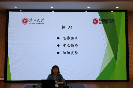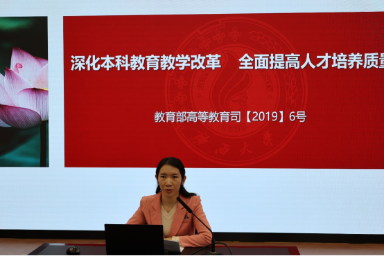 接下来,陈碧兰副院长解读了《深化新时代教育评价改革总体方案》。陈副院长重点阐述了习近平总书记关于教育的重要论述和全国教育大会精神,办好人民满意的教育,希望全体教职工认真学习并贯彻总体方案,贡献外语力量,努力创建“双一流”本科院校。接着,白佳芳副院长结合学院的教育教学实际情况,解读了教育部高等教育司[2019]6号文件——《深化本科教育教学改革 全面提高人才培养素质》。