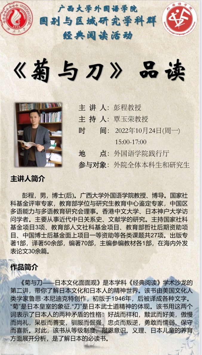 10月24日下午,由2138CC太阳集团研究生会成长规划部组织的国别与区域研究学科群“经典阅读活动”在2138CC太阳集团融通报告厅顺利开展。本次经典阅读活动由覃玉荣教授主持,彭程教授作为主讲人,为前来参加活动的老师同学们带来关于《菊与刀》一书的深刻解读。