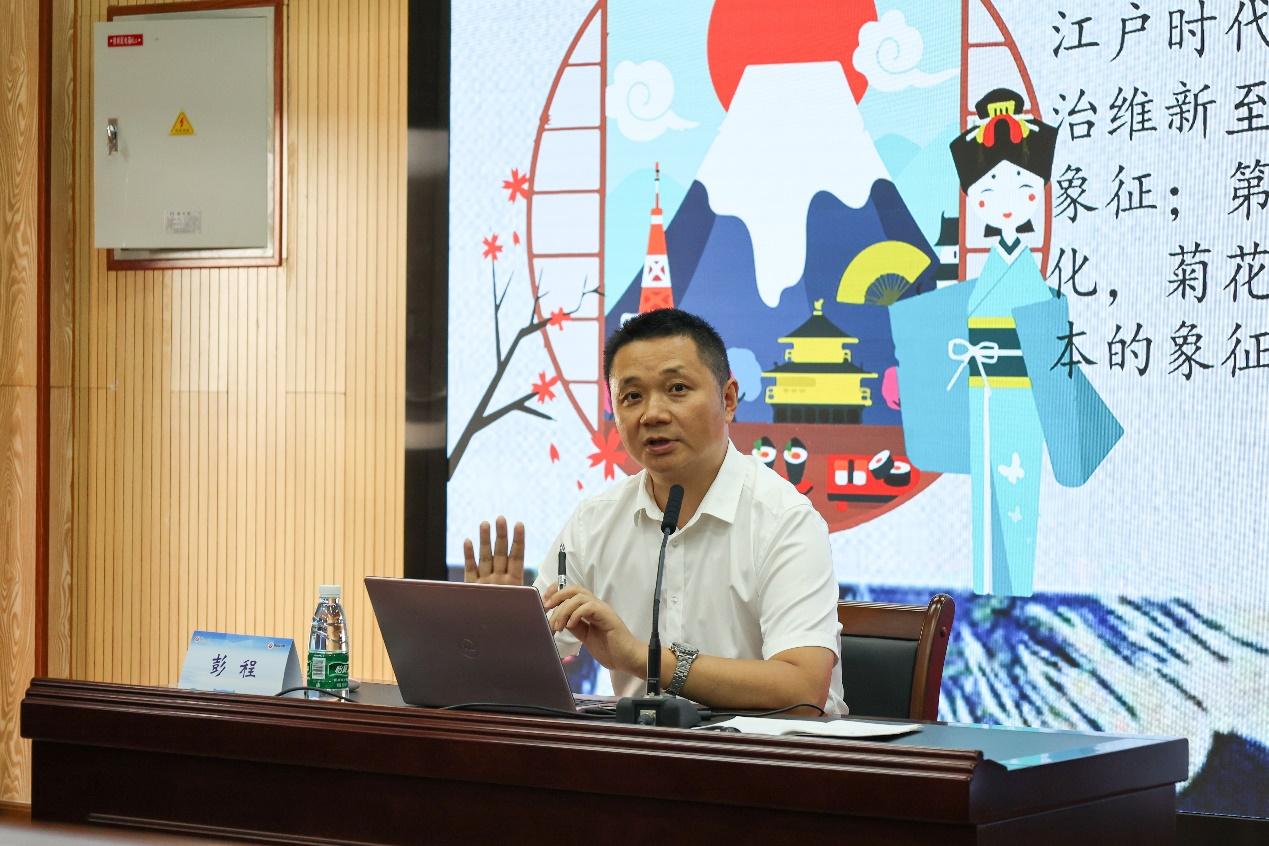 《菊与刀》,由美国文化人类学家鲁思·本尼迪克特创作,首次出版于1946年,该书主要是研究日本的风俗习惯,其研究目的是为美国政府战后的对话政策提供理论依据。讲座伊始,彭程教授首先提出一个问题,即本书书名为何会是“菊与刀”?关于“菊”,日本的菊花最早是被当作药草从中国传入,传入时间大概是在奈良末期至平安初期,在平安时代菊花已经成为日本皇室贵族的符号。江户时代,菊花作为国花的文化开始在民间普及,几经历史的发展,菊花逐渐和樱花一样成为日本的象征;而关于“刀”,东洋刀(即日本刀)是世界三大名刀之一,是二战时期指挥官的必备装备,这让日本人逐渐与其建立起了一种特殊情结,是日本武士道精神的体现。该书用这两个词表示了日本人的两种矛盾的性格:好战而祥和、黩武而好美、傲慢而尚礼作者、呆板而善变、驯服而倔强、忠贞而叛逆、勇敢而懦弱、保守而喜新。