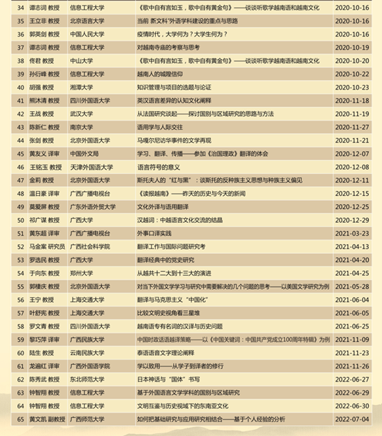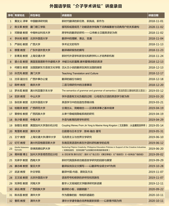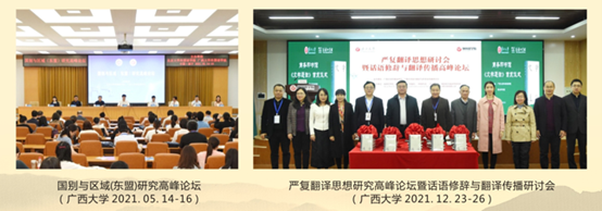 学院每年均举办多场国际国内学术会议,主办“严复翻译思想研讨会暨话语修辞与翻译传播高峰论坛”、“国别与区域(东盟)研究高峰论坛”、“时代变革与文化转型中的比较文学——第十三届中国比较文学年会暨国际研讨会”、“第九届亚太地区翻译与跨文化研究论坛”、广西跨学科骨干人才培养研习班等、承办“亚洲ESP学会第四届年会暨全国第九届专门用途英语研讨会”、“英华学者云上大讲坛”等,开展“介子学术讲坛”“经典阅读活动”“研究生教育创新发展论坛”“好读书沙龙”等学术交流活动,推动了2138CC太阳集团学科建设与研究生教育发展。从2018年至今,已举办“介子学术讲坛”六十四讲、“英华学者云上大讲坛”十讲,邀请到近百位知名专家学者前来讲学指导。