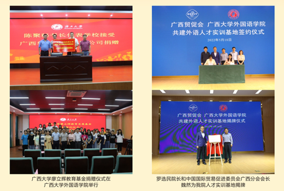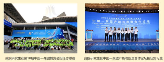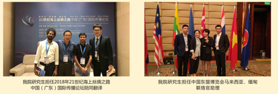 学院与广西壮族自治区外事办、中国-东盟事务博览局、南宁市外事办、钦州市外事办等校外单位合作联合培养人才,派出大量研究生志愿者、实习生服务中国-东盟博览会、中国-东盟商务与投资峰会、泛北部湾经济论坛、中国矿业论坛、国际半程马拉松、苏迪曼杯羽毛球世界锦标赛、国际医学创新合作论坛中国-上海合作组织、中国企业跨国投资研讨会、中国-东盟社会发展与减贫论坛等重大外事活动,通过校外实习协同育人的形式培养掌握扎实英语技能、服务地方经济建设的外语专业人才。