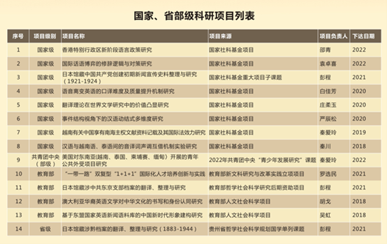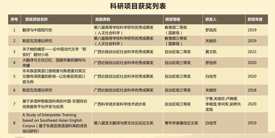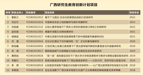近年来,学院研究生导师取得了丰硕的科研成果,现有国家社科基金重大项目子课题1项、一般项目5项、西部项目4项,省部级项目15项。荣获第八届教育部人文社会科学优秀成果奖二等奖、三等奖各1项,广西社科优秀成果奖、科学进步奖10余项。