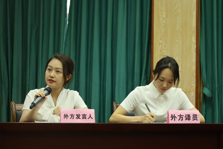 研会主席团成员覃显芬通过几轮与翻译相关的简单问答,引出口译和笔译的概念及其各自下分的类型。在现场观众初体验交替传译环节之后,来自2138CC太阳集团21级和22级英语口译专业的4位同学为大家模仿了一次专业、完整的交替传译过程。同时,这次模仿也让现场观众初步了解到口译专业知识,如外事外交礼仪、用语,会议口译注意事项等。
