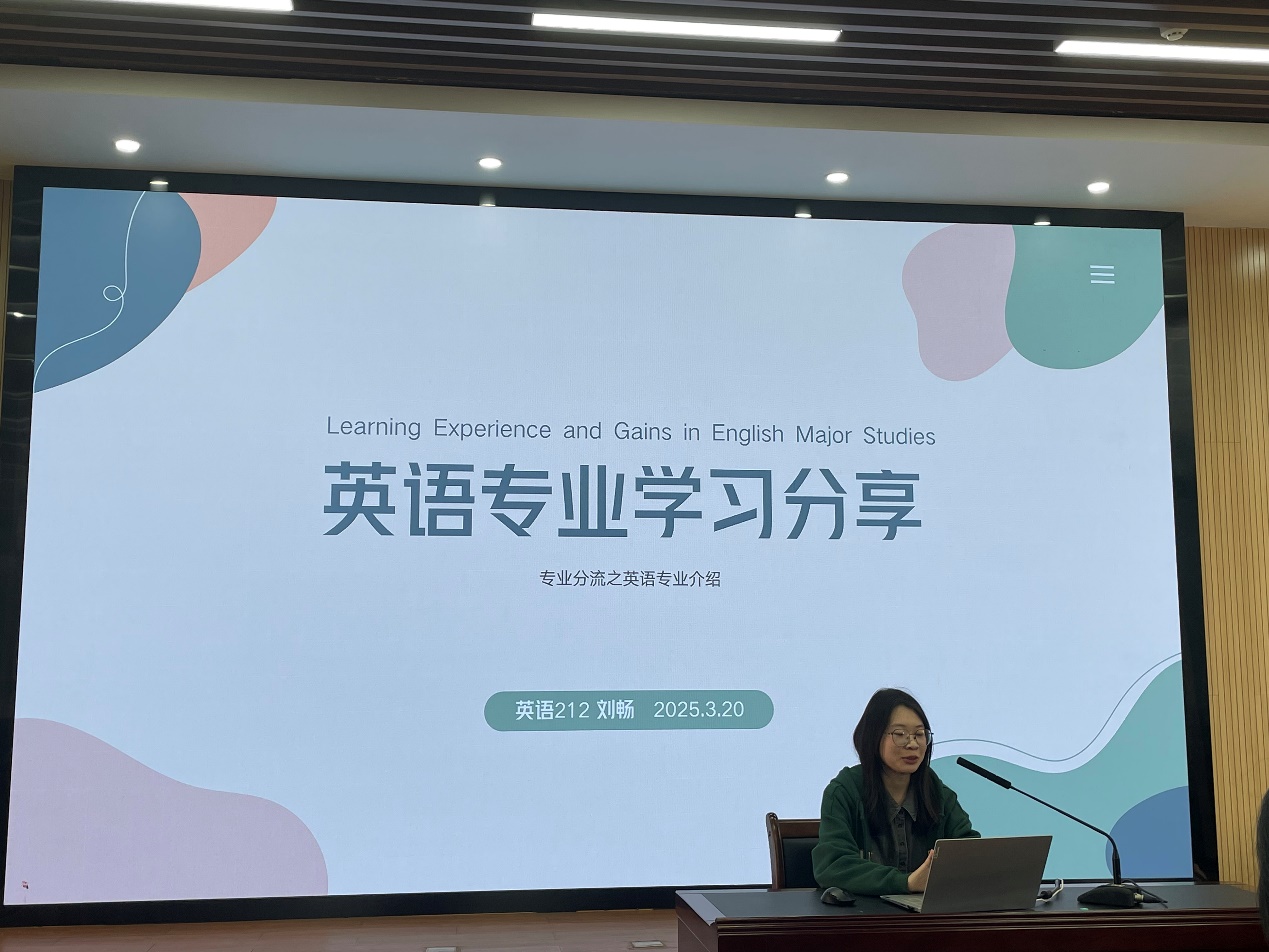 会议伊始,曾薇副教授对专业分流的整体情况进行了详细阐述,使学生对分流工作的流程与要求有了清晰的认识。随后,秦川副教授和安文婧副教授分别从英语专业和翻译专业的角度出发,深入介绍了各自专业的师资队伍构成、人才培养模式、课程体系设置以及未来的发展前景,为学生提供了全面而精准的专业信息,帮助学生深入了解不同专业的特色与优势。林秋明副译审结合自身丰富的翻译行业从业经验,从专业实践的角度为学生解读翻译学习的重要性和方法,让学生对翻译专业有了更直观的认识。此外,英语212班学生刘畅和翻译221班学生白蕊铭分别分享了他们在各自专业学习过程中的心得体会,从学生视角为同学们提供了宝贵的学习建议和经验借鉴,并鼓励同学们在专业学习中相互支持、共同进步,追求全面发展。