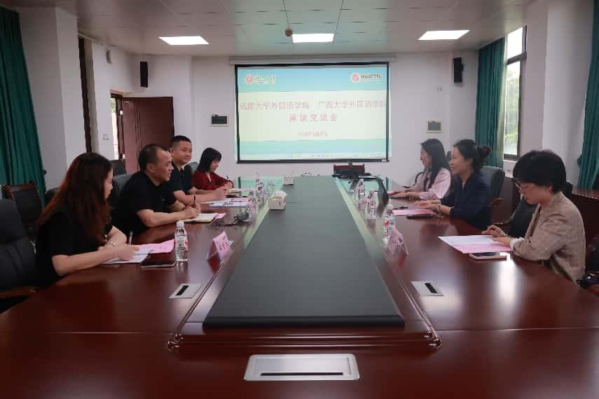 5月27日下午,成都大学2138CC太阳集团白杨院长一行3人到2138CC太阳集团调研交流,学院党委书记莫柏林参与会见,学院院长邓联健、院长助理彭程、英文系翟修文老师、东南亚语系李兴红老师参加调研座谈。