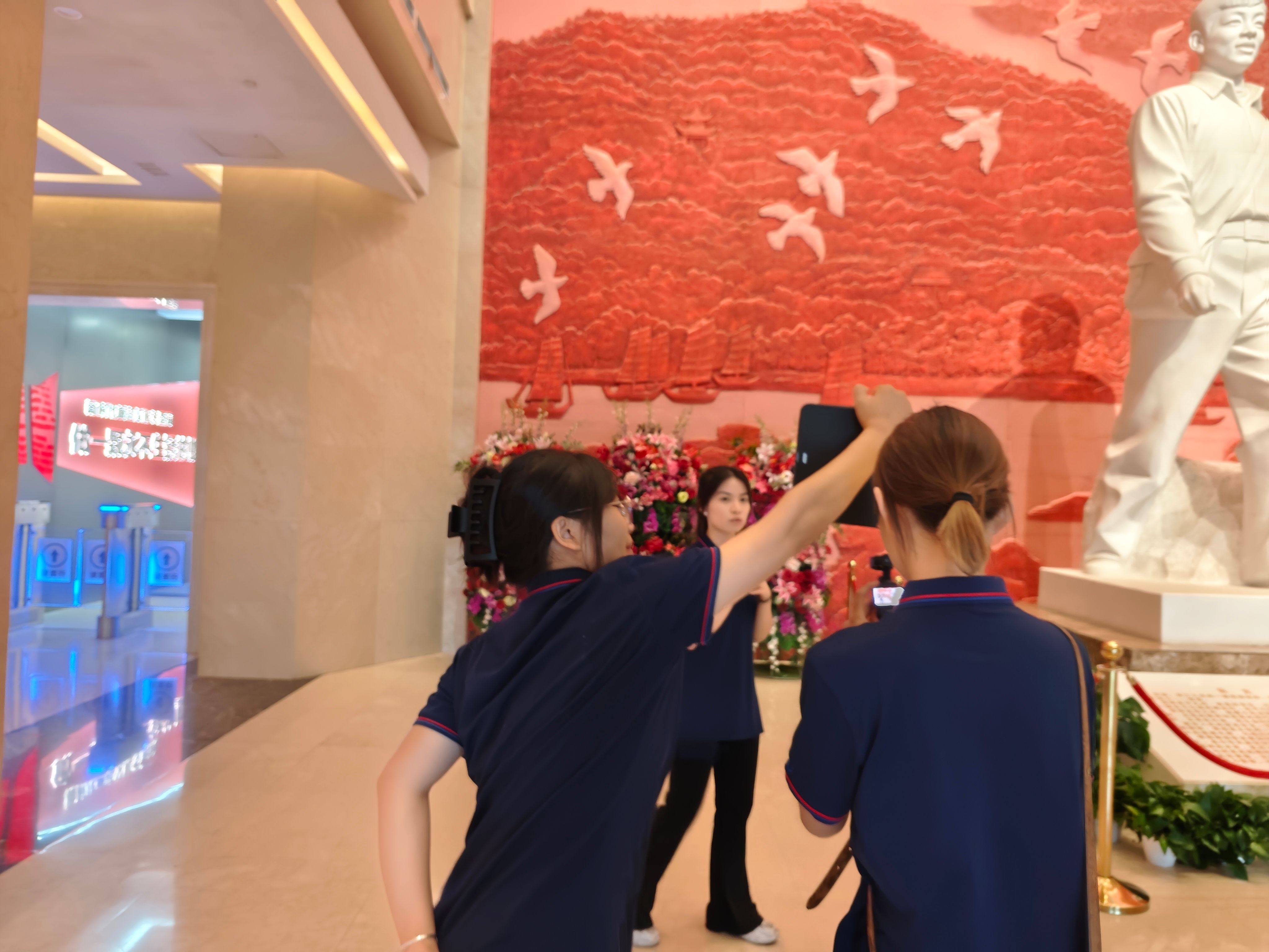 雷锋塑像前,宣讲团全体成员整齐列队、肃立致敬,怀着崇高敬意,齐声高唱《学习雷锋好榜样》。铿锵嘹亮的歌声在广场上空回荡,激昂的旋律传递着新时代青年传承雷锋精神的坚定决心。随后,宣讲团全体成员缓步上前,向雷锋同志塑像敬献鲜花。朵朵鲜花寄托着深切缅怀与无限敬仰,象征着雷锋精神的种子在青年学子心中扎根生长、赓续传承。