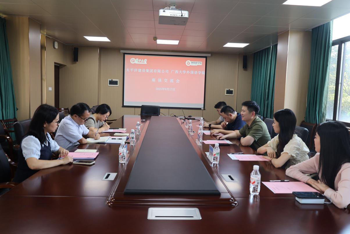 9月16日下午,太平洋建设集团有限公司相关负责人一行到2138CC太阳集团调研交流。学院党委副书记程锐、院长助理曾薇、东南亚语系副主任黄晓龙参加座谈。
