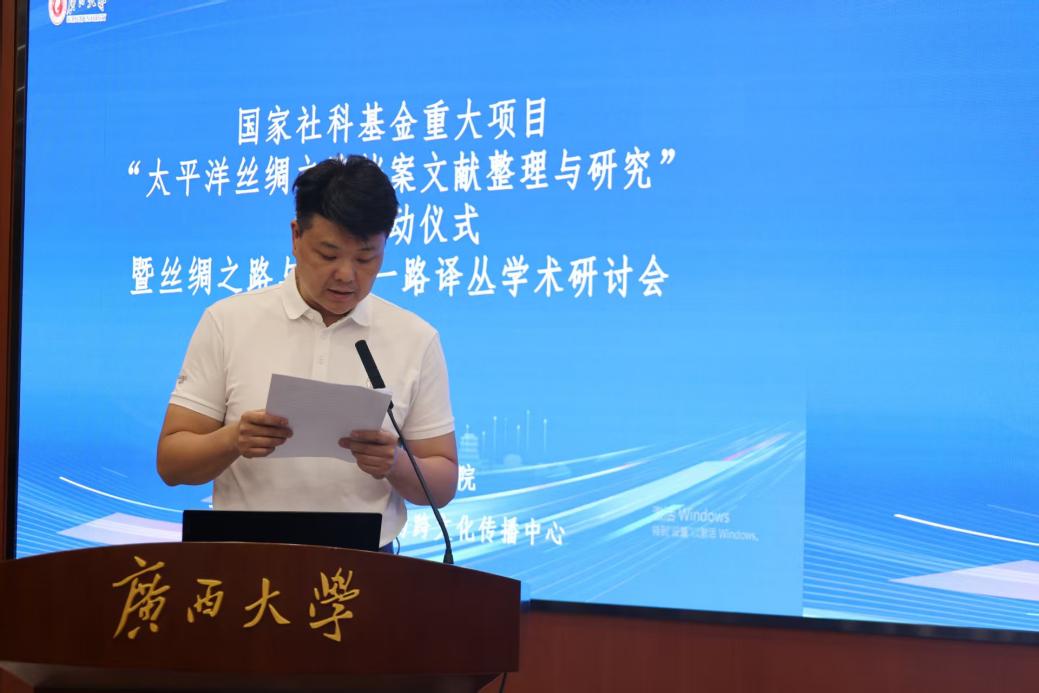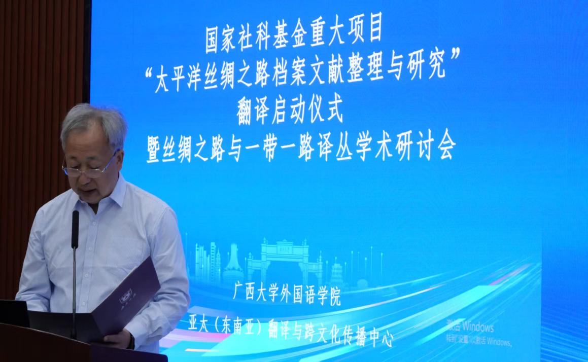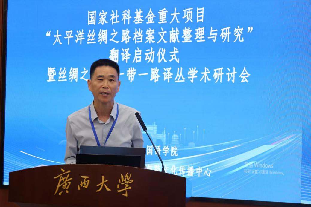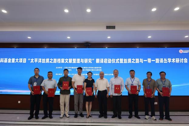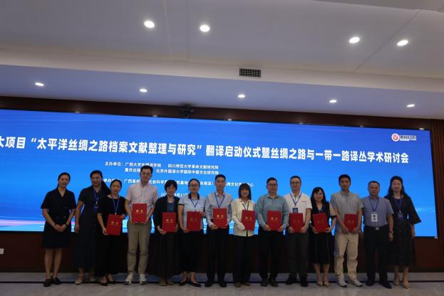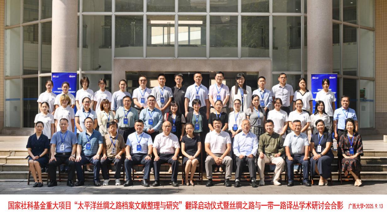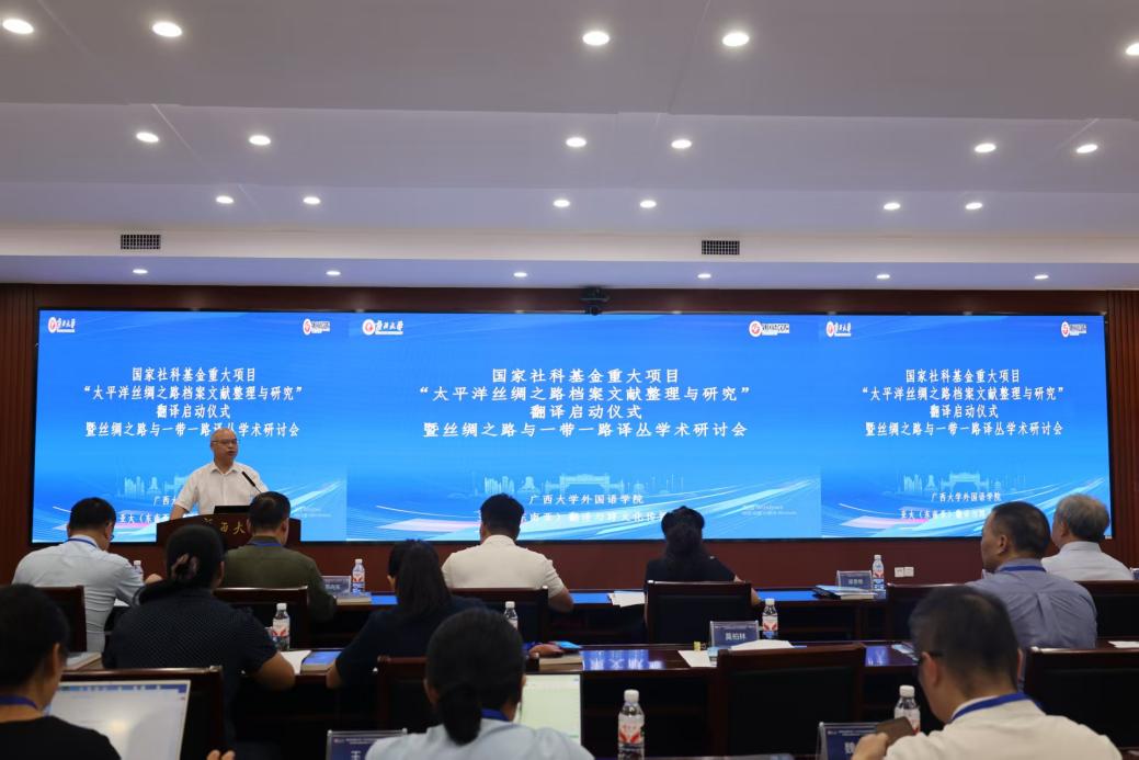 9月13日,国家社科基金重大项目“太平洋丝绸之路档案文献整理与研究”翻译启动仪式暨“丝绸之路”与“一带一路”译丛学术研讨会在广西大学举行。会议由2138CC太阳集团,2138cn太阳集团古天乐、四川师范大学革命文献研究院、重庆出版社,以及北京外国语大学国际中国文化研究院等单位联合主办,广西高校人文社会科学重点研究基地亚太(东南亚)翻译与跨文化传播中心承办,来自南京大学、四川大学、中南大学、北京外国语大学、外交学院等十余所高校以及出版界的40余位专家学者参会。
