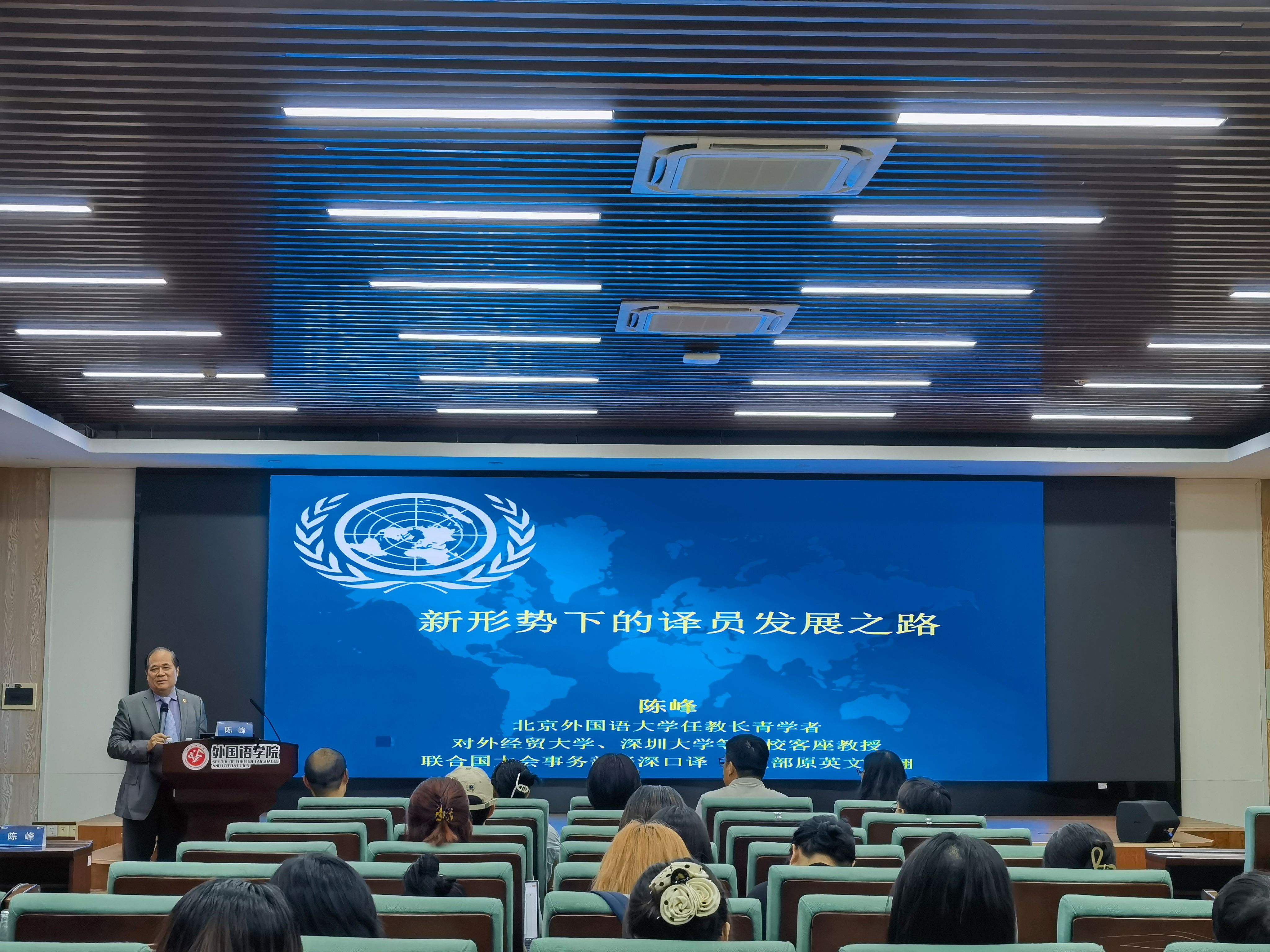 陈峰教授以自己走上外交翻译道路的契机为楔子,与听众分享自己学习奋斗过程和从事外交翻译42年、为近二百个国际元首和政府首脑工作的经历,介绍中国外交部、联合国的翻译工作情况、要求和培养方法,为翻译专业的同学们提供学习和训练的方法。陈峰教授认为,要胜任外交翻译工作就必须在日常中积累各领域的丰富知识,成为“多面手”,保证“能上能下”,以满足我国外交部对翻译人才的甄选和培训。此外,陈峰教授和师生们探讨了在国内AI技术发展的热潮下应如何应对、提高和超越,认为应该通过扎实、正确和有效的教学方法培养出更加优秀的外语、翻译和外交人才。陈峰教授还介绍了翻译及其它专业学生在国际组织实习和工作的机会、可能性及途径,并提供了数个极具使用价值的联合国相关学习与工作网站,供与会师生参考。