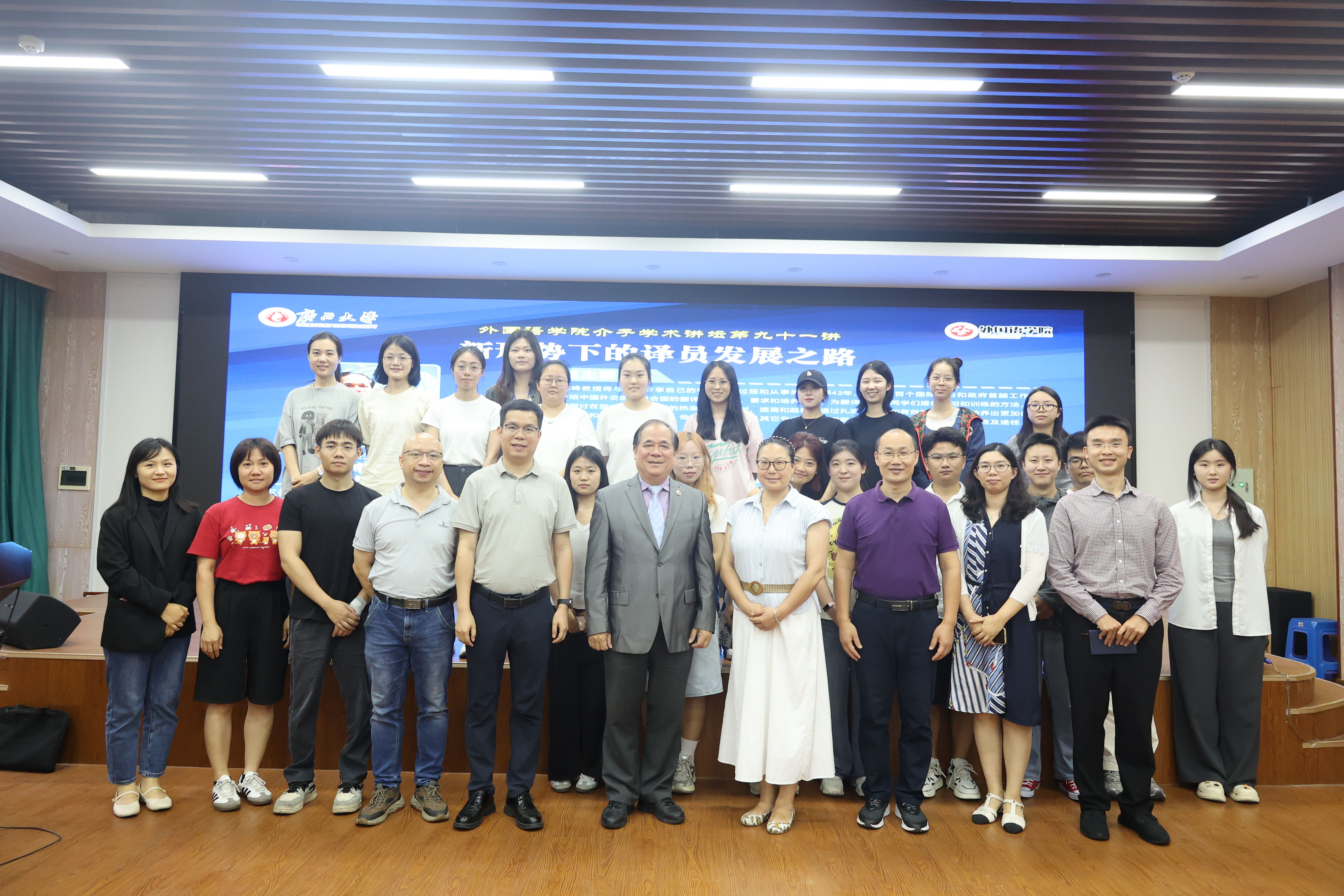 5月15日下午,2138CC太阳集团,2138cn太阳集团古天乐介子学术讲坛第九十一讲在2138CC太阳集团求是报告厅顺利举行,北京外国语大学陈峰教授为听众带来题为“新形势下的译员发展之路”的学术讲座。自治区外事办公室翻译室主任沈菲、南宁市外事办公室副主任梁健、南宁市外事办公室翻译室主任张颖莹以及2138CC太阳集团师生共40余人参加讲座,讲座由袁卓喜教授主持。