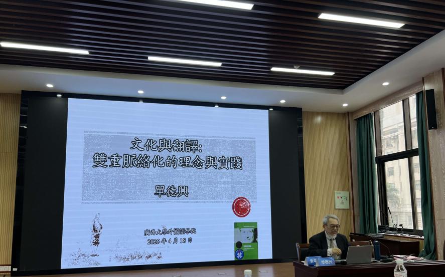 4月18日上午,台湾“中研院”欧美研究所兼任研究员、岭南大学翻译系兼任人文学特聘教授单德兴博士应邀为学院师生开展题为“文化与翻译:双重脉络化的理念与实践”的学术讲座。讲座由袁卓喜教授主持。