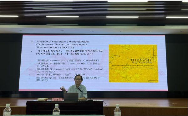 讲座伊始,陈教授介绍了他的两本专著:《本一而万殊:中国古典文学翻译及传播》和《再述历史:西方翻译中的前现代中国文本》,从中提出了古典文学外译的理论,翻译研究中有待全面探索的,是将经典著作从一种语言翻译成多种语言的现象。