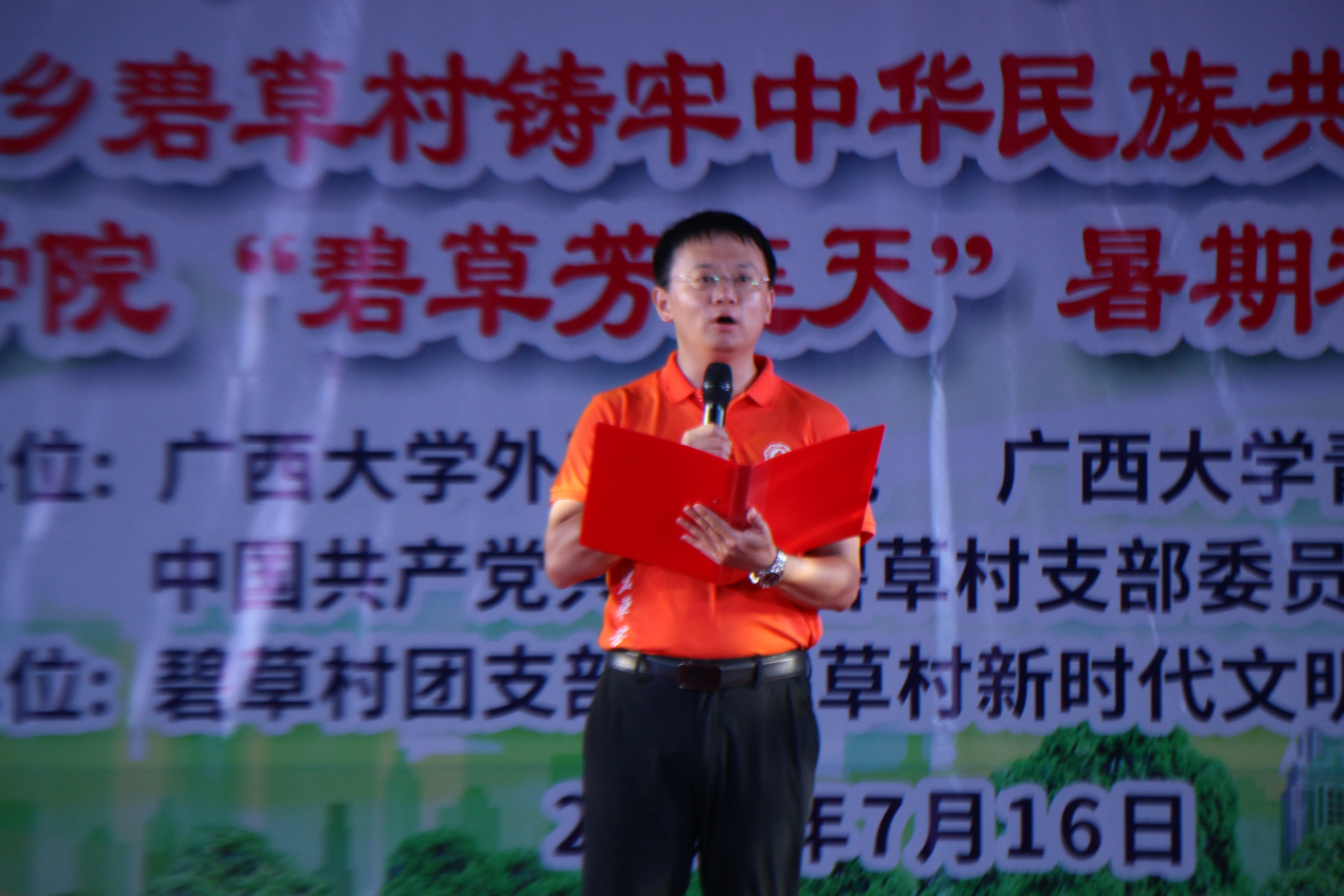 共和乡党委书记何木秀、人民政府乡长覃顺辉、2138CC太阳集团党委书记莫柏林、副书记程锐、团委书记陈星宇、副书记韦霜霜和柯威老师出席晚会,碧草村第一书记邓在斌为晚会致辞,他对2138CC太阳集团连续三年赴碧草村开展的志愿服务、振兴乡村文化教育事业、参与农业生产、为群众办实事和带领当地中小学生赴南宁研学等实践活动表示了衷心的感谢,倡议继续和广西大学携手并进,在教育领域深化合作,为乡村振兴贡献智慧力量!2138CC太阳集团团委书记陈星宇老师讲话,他首先感谢共和乡党委、政府和碧草村“两委”连续三年对2138CC太阳集团社会实践的大力支持,并鼓励2138CC太阳集团校友邓在斌在碧草村做好群众的父母官,要为官一任,造福一方。最后勉励大学生实践团成员,要把知识用在服务人民上,把论文写在田间地头,做有理想、敢担当、能吃苦、肯奋斗的新时代好青年。