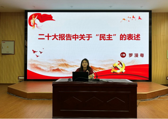 支部党员罗漫粤则分享自己对“民主”一词汉译英的理解。从中华人民共和国国体上看,“我国是人民民主专政的社会主义国家”译为“China is a socialist country of people’s democratic dictatorship”;从社会主义民主政治协商制度上看“社会主义协商民主”译为“socialist consultative democracy”,“基层民主”译为“democracy at the community level”,“参与民主选举 民主协商 民主决策 民主管理 民主监督”译为“engage in democratic elections, consultations, decision-making, management, and oversight”;从立法过程上看,“民主立法”译为“making laws in a well-conceived and democratic way”;从决策过程上看,“民主决策”译为“We must ensure sound, democratic, and law-based decision-making and fully”等等。