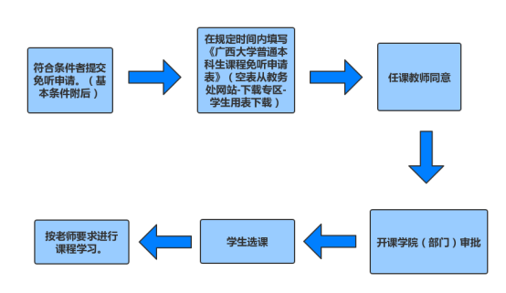2.除按规定不能免听或免做的课程之外,初修课程不及格没有获得相应学分,重修该门课程时与其它课程冲突的,可以申请免听。