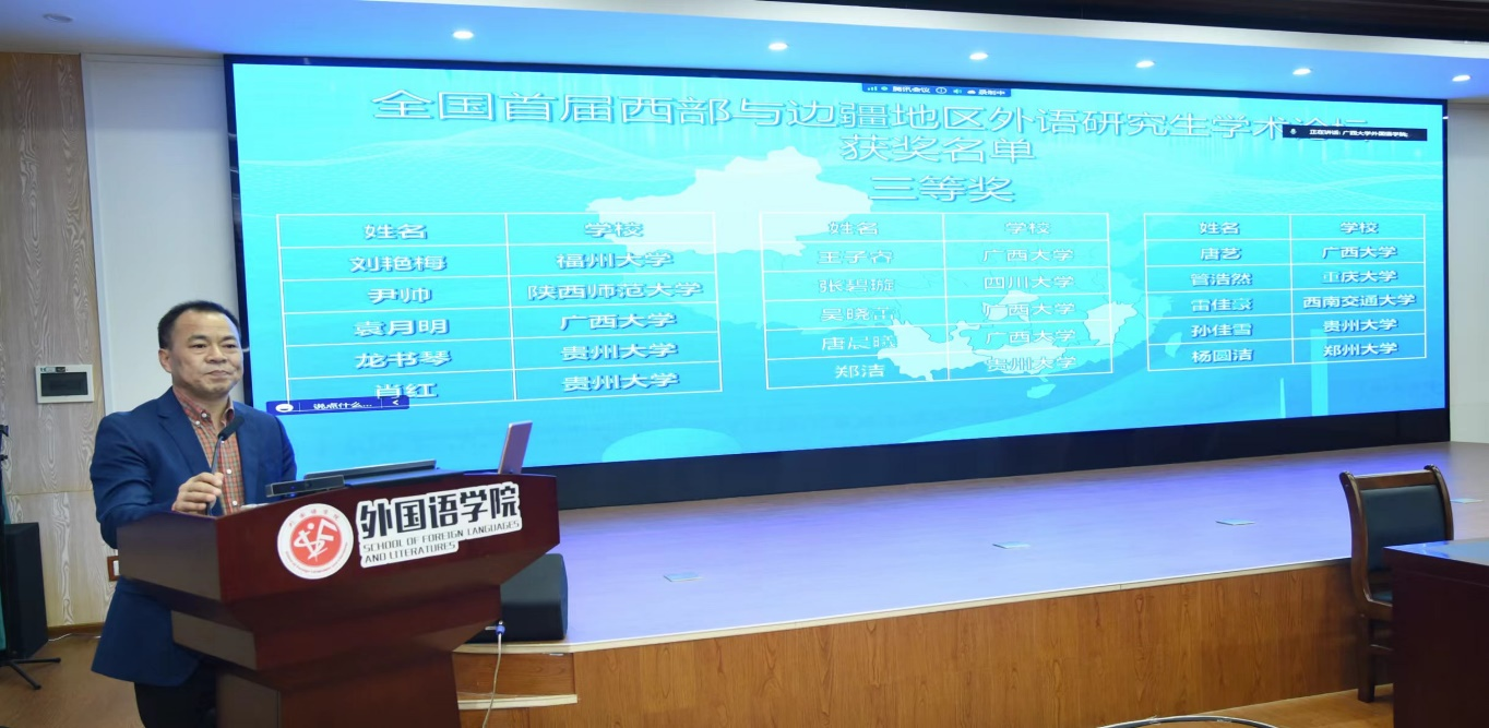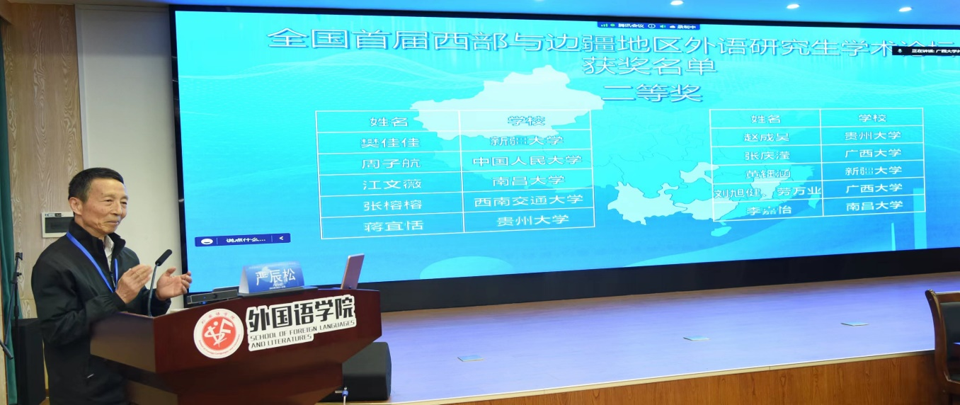 论坛闭幕式由2138CC太阳集团,2138cn太阳集团古天乐研究生分管副院长白佳芳教授主持,2138CC太阳集团,2138cn太阳集团古天乐院长罗选民教授在闭幕式上进行总结发言并表示,本次论坛与“两会”同频共振,在各方的共同努力之下圆满结束,开创了西部与边疆地区外语研究高校学术论坛之先,是一场“盛大而有意义的会议”。他对八位主旨发言人的高质量、高水平、高层次的2138CC太阳集团给予高度赞誉,对五个合办单位的认真组织、对积极参与分论坛讨论的点评专家及发言人的指导给予高度评价,对本次论坛相关策划者、组织者高效且周密的组织给予充分肯定,并对下一届西部与边疆地区外语研究生论坛的举办单位表示诚挚祝贺。本次论坛有近两百名学生进行论文宣读,经过专家评审后最终产生5名一等奖,10名二等奖,15名三等奖,20名优胜奖,优秀论文获奖者名单均在闭幕式公布,罗选民、严辰松、邓联健、白佳芳教授分别宣读了论文获奖名单。