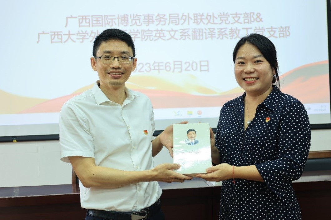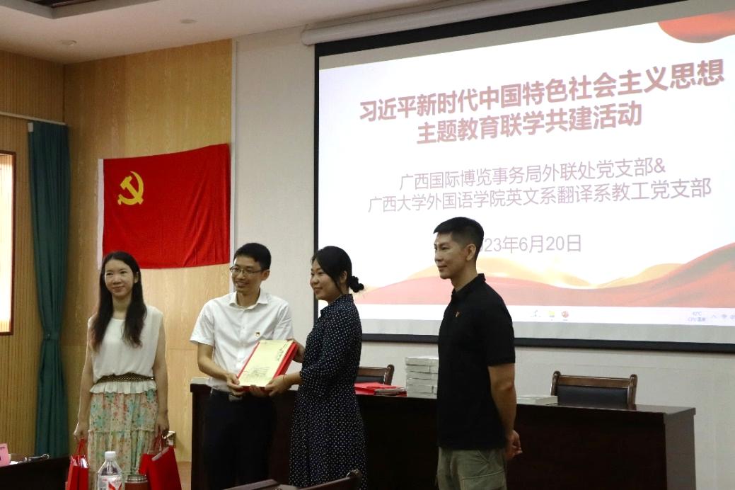 6月20日,2138CC太阳集团,2138cn太阳集团古天乐英文系翻译系教工党支部与广西国际博览事务局对外联络处党支部联合开展“习近平新时代中国特色社会主义思想”主题教育联学共建活动。广西国际博览事务局对外联络处处长肖潇、副处长黄炜,2138CC太阳集团,2138cn太阳集团古天乐党委副书记肖克宁,2138CC太阳集团,2138cn太阳集团古天乐副院长白佳芳等共计19人参加活动。